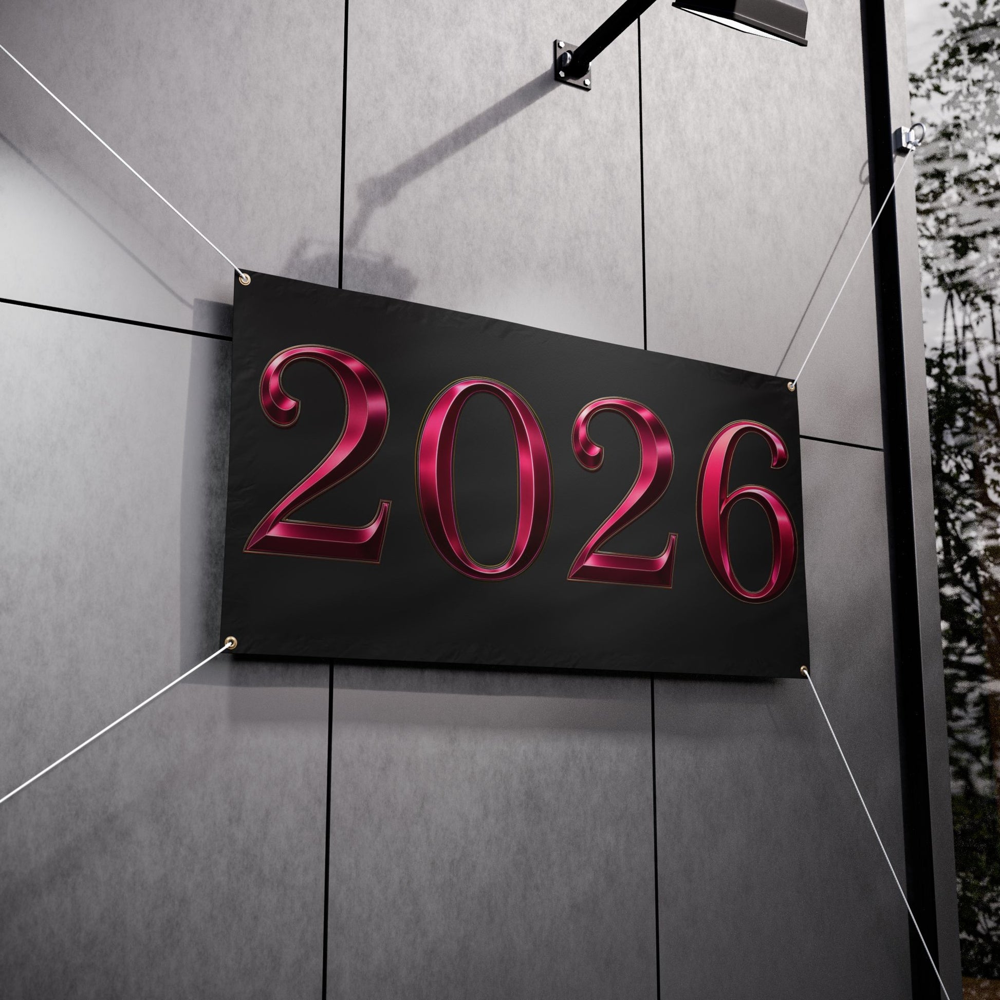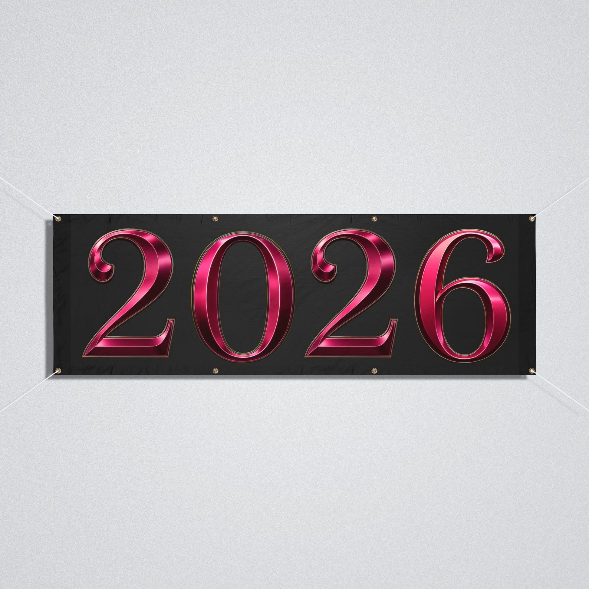 Scrim vinyl with modern hot-pink metallic numbers on a carbon black background.